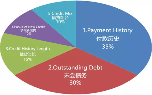 传统的FICO评分模型的基本思想是比较借款人信用历史资料与数据库中的全体借款人的信用习惯,检查借款人的发展趋势跟经常违约、随意透支,甚至申请破产等各种陷入财务困境的借款人的发展趋势是否相似。如图2所示,它主要从五个方面考察用户的信贷资质。但随着信贷业务的进一步开展,FICO信用评分由于单一的标准、严苛的门槛和片面的评估结果而饱受诟病。