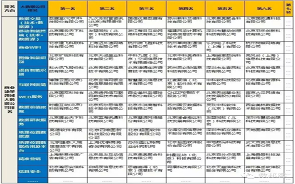 3.排名标准:随着每个参与排名专家的关注点不同(如:有些专家关注发展潜力,有些专家关注数据稳定性与规模,有些专家关注大数据技术,有些专家关注商业应用的收入等等…)故其权重也不同,因此该"综合排名"也不是完全符合细分到每个行业的排名;我们编写这个排名并不是学术型排名,而是为了帮助各大数据生态圈上的各家公司更好的发展,以及大数据所服务的客户更加了解大数据。