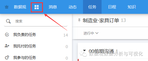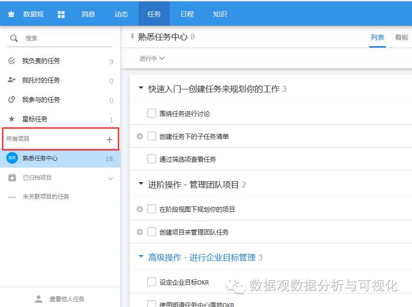 在这里大家需要注意的是,目前,在明道账户中,只有建立在“所有项目”模块中的任务(如下图所示位置),其数据方可导入数据观进行分析,导入后,此处的任务数据均存在于“明道任务汇总”这一数据表中,当我们制作单一项目的看板时,可以借助数据观的过滤功能,以“项目名称”作为过滤条件快速实现。