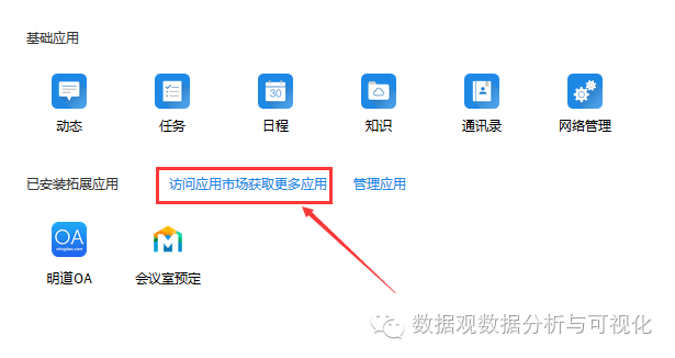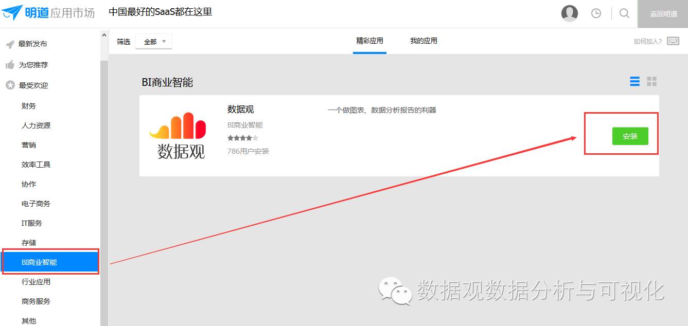 首先,需要在你的明道账户中安装“数据观”。点击图3所示位置,访问明道应用市场,进入明道的应用市场的“BI商业智能”找到“数据观”,点击安装,即可完成。