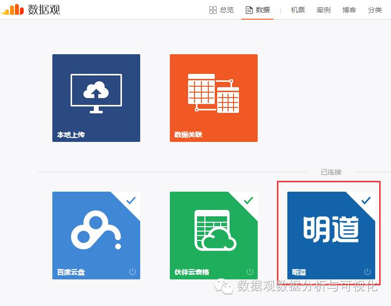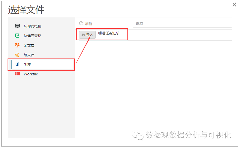 然后,在数据观中连接明道。如下图所示,点击“导入数据”,在弹出框中点击明道的图标,按照提示进行授权后,点击文件列表前端的“导入”按钮,即可导入在明道中创建的任务数据。