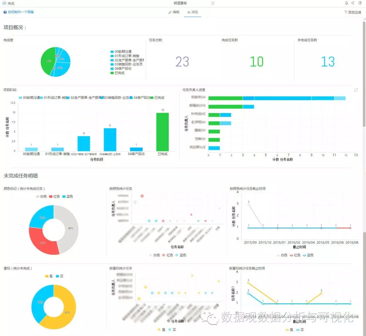 在上图所示的看板中,第一部分展示的是项目概括。首先通过饼图、KPI图和柱图可以直观看出该项目下各阶段任务的比例和数量,然后用条图呈现出不同任务负责人负责的各个任务的进度。第二部分则对未完成任务进行了详细分析。在这一部分,主要通过明道里的颜色标记和星标两种方式,分别从不同紧急程度任务的占比、 各负责人未完成任务的详情、不同截止时间处各类任务的数量三个角度,进行了直观呈现。在这里,我们设置红色为紧急任务,蓝色紧急程度次之,白色是未分类的任务;黄色是添加星标的任务,蓝色是未添加星标的任务。