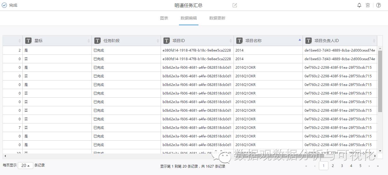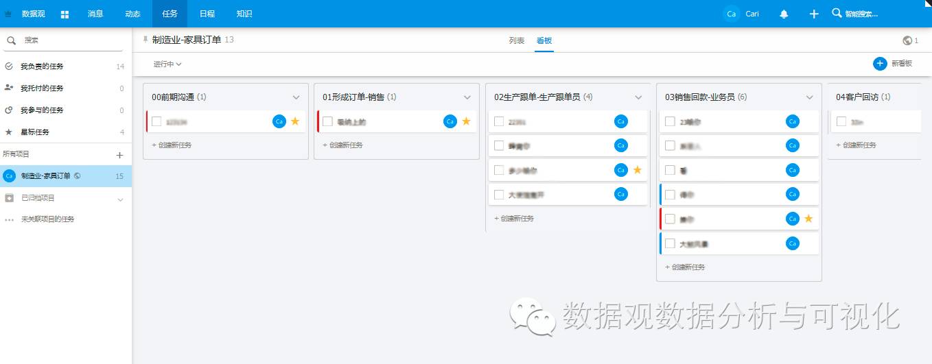 我们用一组基于明道项目管理方式(如图1所示)形成的数据,使用数据观制作了一个简单看板(图2所示),向大家直观呈现一下两者结合所能实现效果: