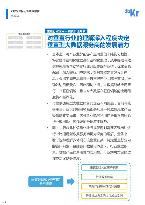 垂直领域大数据应用提供商需要有更多垂直行业内的客户积累、行业数据积累、数据产品的易用性与实用性以及行业解决方案的过往成功案例。