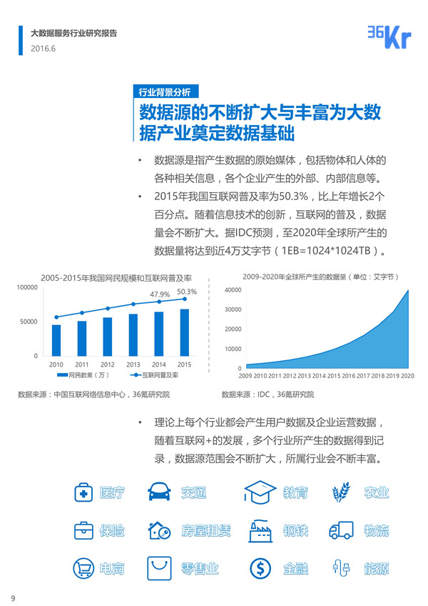 数据处理与存储技术的快速发展与使用成本的显著下降使得通过网络录得的海量数据得以被分析并利用。随着互联网+的发展,多个行业所产生的数据得到记录,数据源的不断扩大与丰富为大数据产业奠定数据基础。