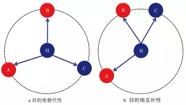 居民出行活动中,通勤、通学的出行目的地相对固定,就餐、娱乐、购物等出行目的地选择较为灵活,因此具有替代性和互补性。如下图所示,假设居民从家H点出发,希望就餐后购物,A,B两地可以就餐,C地可以购物。若H至三地距离相似,且A,B两地至C的距离相差不多,则A,B具有替代性;若B和C较A和C临近,则在A,B与H距离相似的情况下,由于B,C的互补关系,选择B就餐的可能性将明显大于A,从而满足居民活动次序的需要。