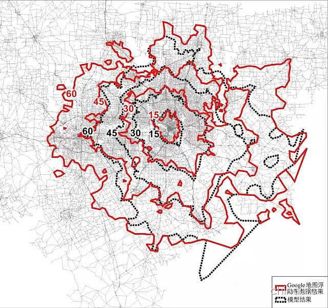 在大数据环境下,特别是针对浮动车数据和地图信息的应用,可以获得较为准确的路段车速数据及区域间的车辆出行时间。同时,采用网络等时线图可以比较直观地对比交通模型和大数据的路网出行时间。下图是美国北德克萨斯大都会(North Central Texas Council of Governments, NCTCOG)各区域至市中心的等时线,图中虚线和实线是早高峰模型与Google地图浮动车数据的对比。可见,即使是发达国家的成熟交通模型,道路交通出行时间方面的计算仍然存在较大偏差。因此,中国城市交通模型也应适当利用大数据进行校核。