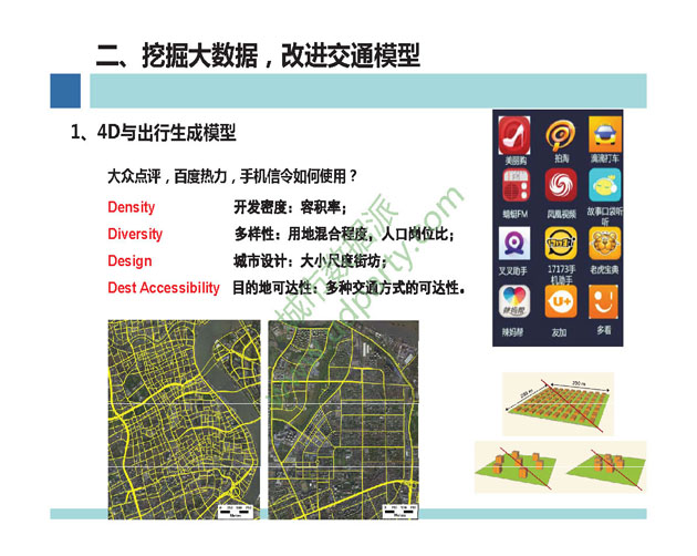 4D模型中,开发密度主要指容积率,用地多样性表现出人口和就业岗位的混合程度,城市设计主要体现在路网形态,例如街区大小和交叉口间距。用地多样性和路网密度直接影响人员活动热度和步行交通方式选择。上述3D因素可以通过传统数据进行计算。目的地可达性指标具有不同的计算方式,包括基于一定时间内覆盖的城市活动要素绝对值,或基于效用理论计算方法等。其核心要素是城市活动要素的度量,即一定时间可达范围内的各种公共设施、人员活动集聚情况等要素的综合度量,过去往往以人口和就业岗位的综合计算来确定。在大数据环境下,各种兴趣点(Point of Interest, POI)数据、百度人流热力图、大众点评网数据、房价网数据等,为城市活动要素的度量增加新的数据源。因此,4D模型中引入大数据分析是可行的。
