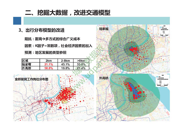 大数据的主要特点是采集手段自动化、覆盖面广、规模巨大、具有较细的空间分辨率和时间分辨率等,为交通模型的精细化研究提供了足够的条件。例如,使用居民出行调查数据来标定出行空间分布模型的参数,由于受到调查样本量的限制,通常无法研究较小区域的客流吸引范围分布。使用手机信令数据、车载GPS数据分析商圈、工业园区等区域的出行分布特征,一方面解决了样本量不足问题,另一方面通常基站分区比交通分区精细很多,可从空间精度上满足小区域的分析要求。再如,在分析轨道交通车站接驳距离时,单纯依靠抽样率较低的居民出行调查数据无法获得每个车站较多的接驳样本,根据手机信令数据对应的地铁车站的专用基站信息,便可获知每个车站足够的样本来分析乘客接驳轨道交通的信息。