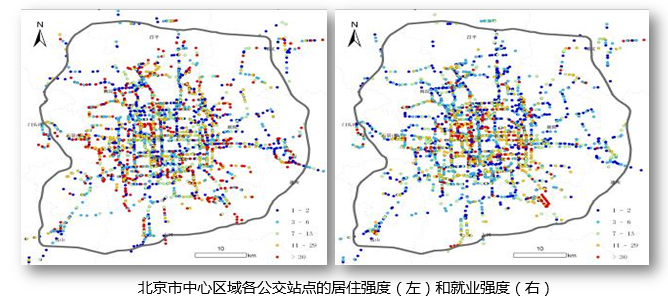 示范2:北京市中心区域各公交站点的居住强度和就业强度