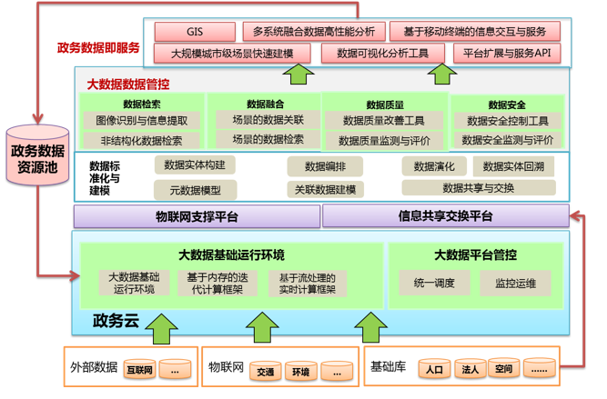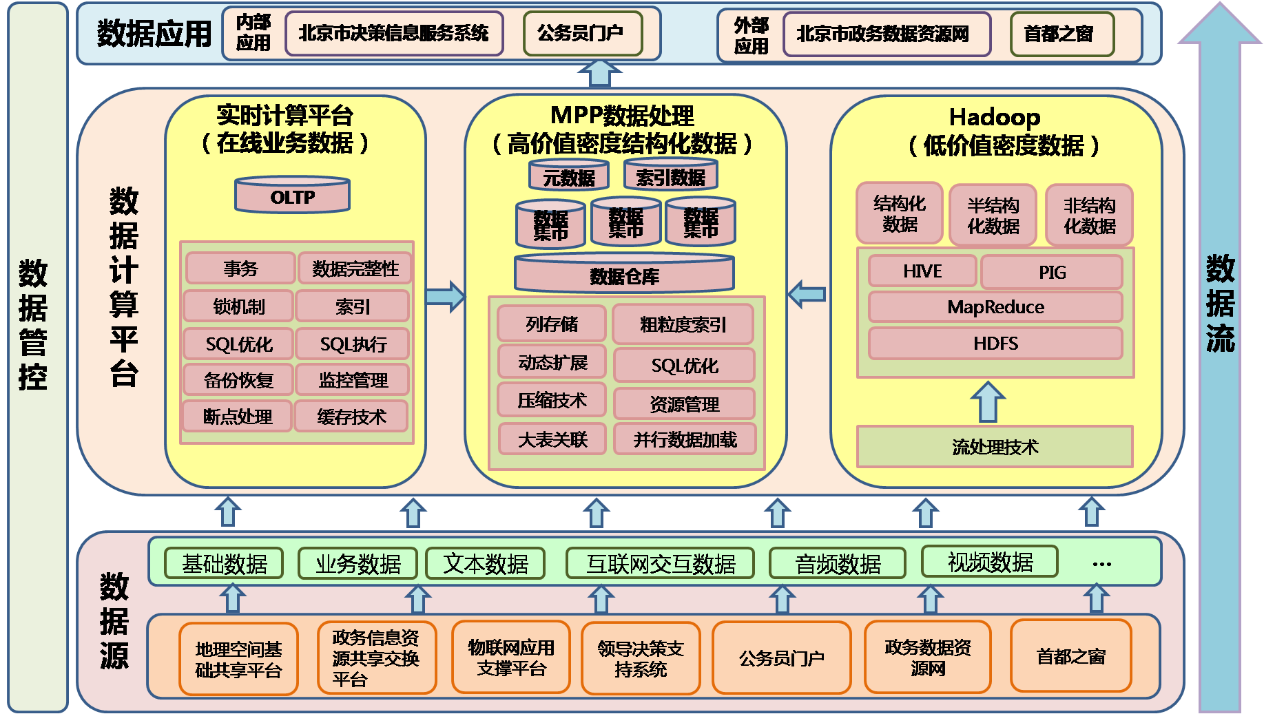 向各委办局大数据应用平台提供大数据服务支撑,通过首都之窗、Data网站等办公门户向政府部门和社会公共提供数据使用服务。为需求单位提供大数据处理通用接口及工具,并统一实现与外部数据的接入服务。通过物联网平台、互联网平台、共享交换平台等信息化基础设施和系统汇集、存储、分析相关数据资源。强调了对各类数据的处理能力,包括对结构化的、非结构化的、音频、视频、包括各种结构的数据处理能力,特别是有来自于物联网的实时数据,和互联网的日志数据等。