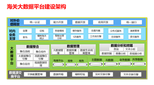 简单来说就是建立一个多方数据共享,互联互通的海关大数据平台,在上面重新构建新的业务系统,实现业务系统的互联互通,并利用大数据驱动海关、监管、征税、查私和编制海关统计智能化和自动化的处理。