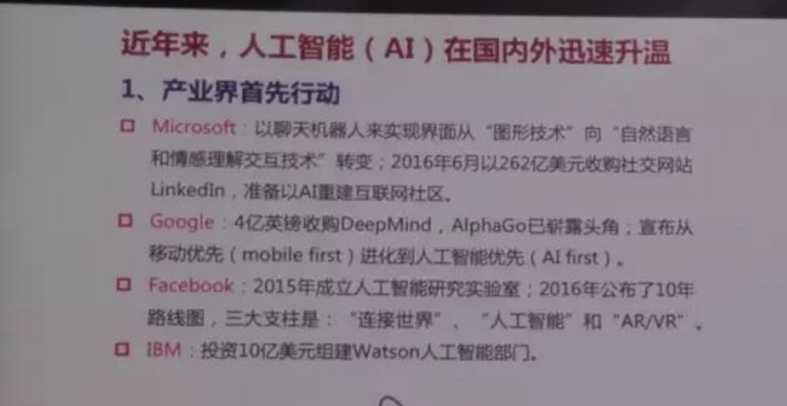 我想讲三个部分,首先讲问题的提出,我们看到近年来在全世界AI迅速升温,和以往不一样,这一次是企业界开始进行启动,实际上美国的很多企业,很早就进行了布局,譬如说微软,很早就布局聊天的机器人小冰,希望由过去的图形界面windows,转化为自然语言理解的界面。微软已经做好必要的技术储备,并且收购了美国的社交网站,准备使它智能化,刚才百度李彥宏先生也讲了,准备从移动优先进化到AI优先。