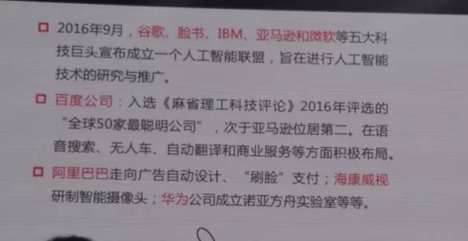 IBM的watson医疗诊断系统已经在中国开始进行实践。在去年9月,美国的5个大的科技巨头宣布成立一个AI联盟,旨在进行AI方面的计算研究和推广。中国的公司也不甘落后,百度早在AI进行了专业布局。阿里巴巴在AI方面也转向很快,他们公司的转向也很明显,杭州的海康威视作为全世界最大生产摄像头的公司,已经开始推出智能化摄像头,把深度学习的芯片和摄像头连在一起,华为公司也在这方面有所布局,尤其是在自然语言理解方面。