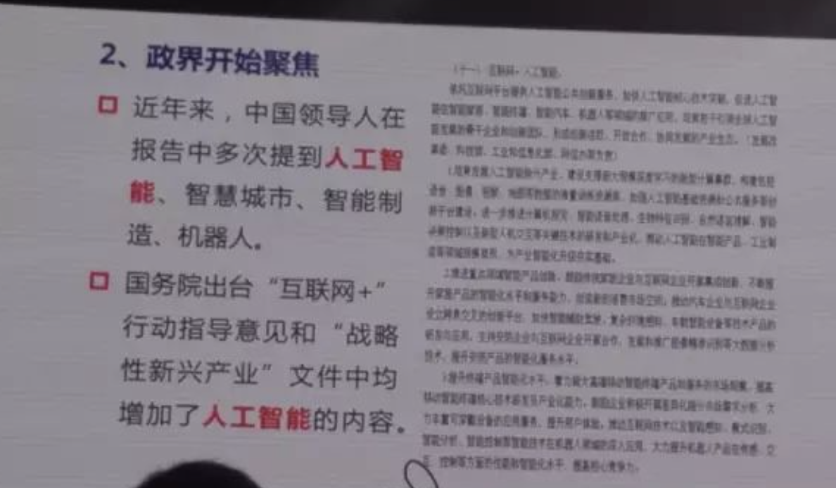 中国政府十分重视AI,尤其近两年来中国领导人在报告中多次提到AI,实际在内部讲话中间提到的次数更多。国务院出台了互联网+人工智能的文件,全面布局智能发展。