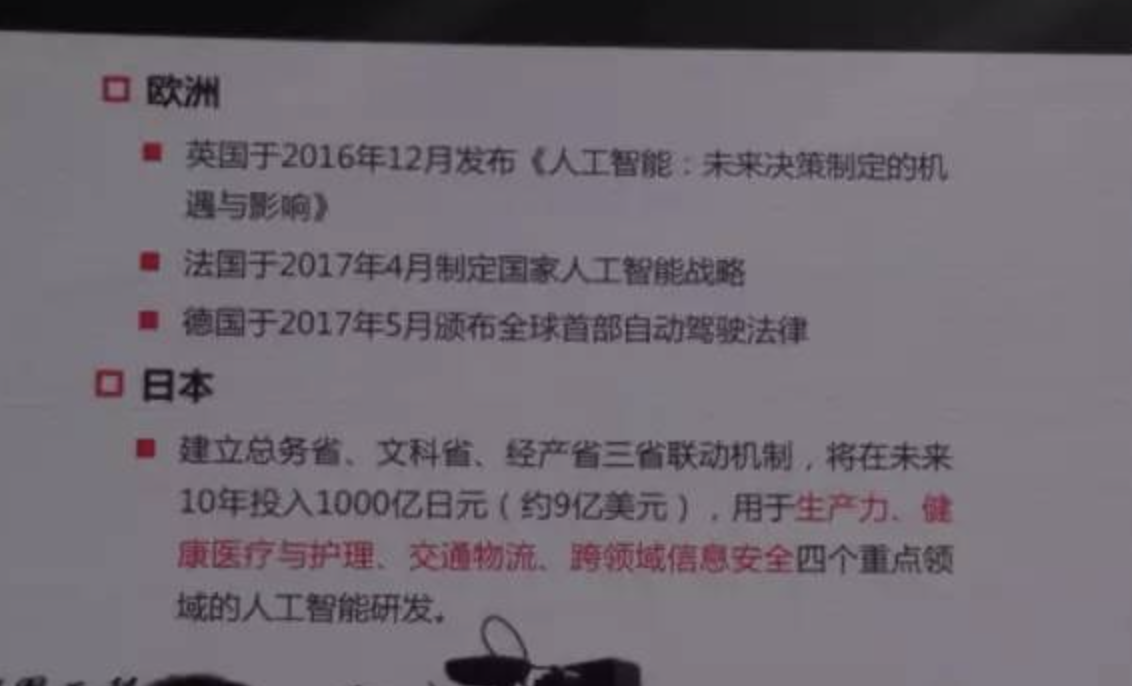 在欧洲,英国去年年底发布《AI未来的决策,制定的机遇和影响》,法国在今年4月份制定了《国家人工智能战略》,德国在今年5月份颁布全国第一部自动驾驶的法律。日本准备在未来10年,要投入100亿日元,用于4个领域的AI的发展,包括基础设施、人才培养、医疗保健和农业等4个领域。