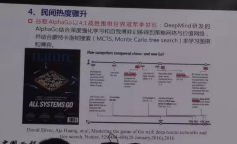 我们看到人工智能在民间的热度上升更快,尤其是当去年谷歌的阿法狗战胜了李世石之后,尤其是它战胜李世石的方式和二十年前IBM深蓝战胜象棋的办法不同,是采用大数据战略的自我博弈训练的方法,引发出现媒体报道的高潮。