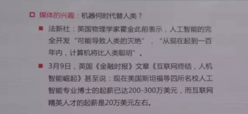 当然媒体更大的兴趣在于机器什么时候代替人类,尤其是有一些科学家,讲的一些有震撼力的话。比如说英国的著名物理学家史蒂芬·霍金说过,在未来100年内结合AI的计算机将会比人类更聪明。当然这些讲话每个人都有不同的理解。