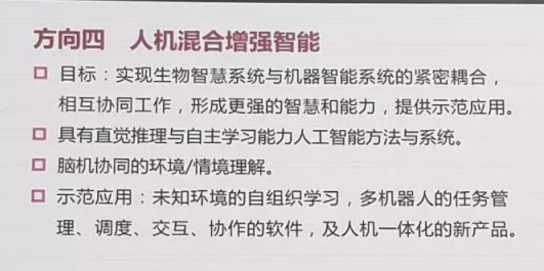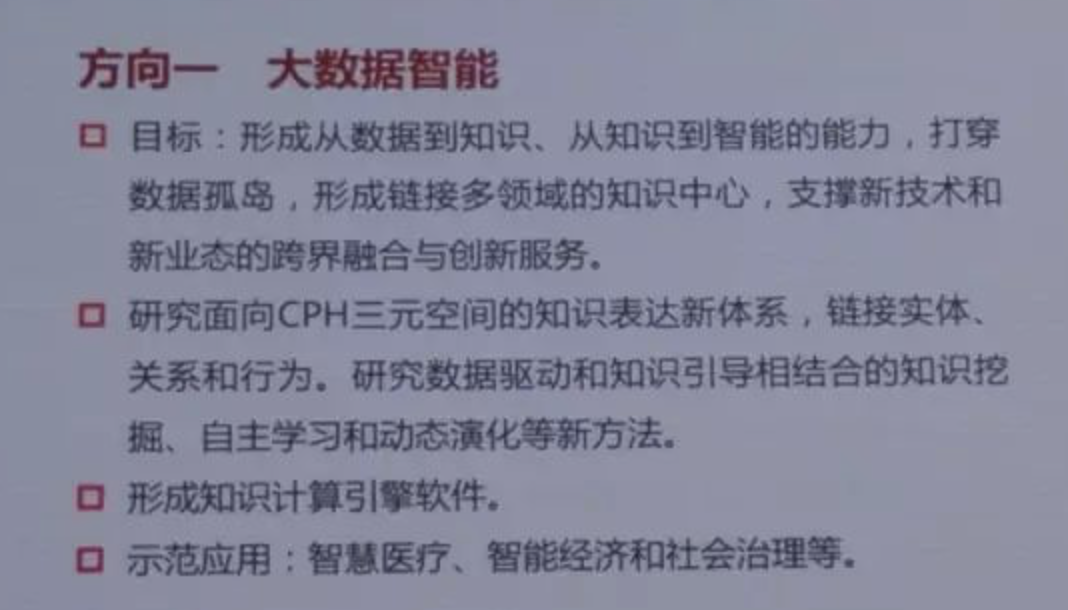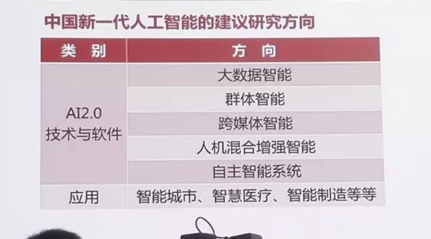 现在我讲最后一部分,中国新一代AI的重点方向,新一代AI工程研究建议从以下5个方面进行认真研究,第一大数据智能,第二群体智能,第三跨媒体智能,第四人机混合的增强智能,第五自主智能系统。它的应用包含智能城市、智慧医疗、智能制造等等,大数据智能因为这几个下面有很多专业术语,所以我就不详细讲了,第二方向群体智能,第三跨媒体智能,第四人机混合的增强智能,第五自主智能系统。最后讲一下应用。
