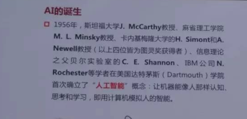 接下来重点介绍人工智能走向2.0。我们知道1956年也就是60年以前,在美国的达特茅斯学院诞生的,当时一批著名的科学家,有斯坦福的麦肯锡、有MIT的Minsky、有CMU的西蒙和Newell,这4个呢是图灵奖获得者,大家可以看到,这3个大学是美国计算机最好的大学,也是AI最好的大学。另外贝尔实验室的香农,IBM的罗切斯特,这也是非常著名的专家,提出了”人工智能“的概念,什么是:让机器像人那样认知、思考和学习,即用计算机来模拟人的智能。