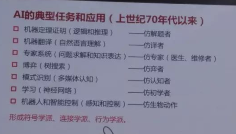 我们可以看到前60年AI的基本任务,都是用计算机去模拟专业人士,模拟人的专业知识,模拟解题的人,模拟翻译的人,模拟医生的知识,模拟下棋人的知识,模拟学者的知识,以及模拟人的各种动作。通过不同的技术,AI分成三派,一派是符号学派,一派是连接学派,一派是行为学派。