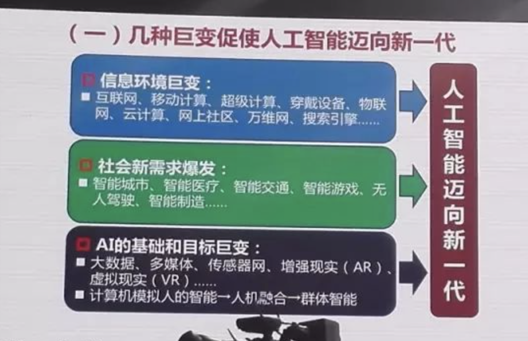 60年以前不用讲60年以前就20年以前,我们还是几个人围着一个计算机转,后来变到一个人用一台计算机,而现在呢,我们一个人已经有几台计算机,我们包里放一个联想的,我们口袋里又放一个,智能手机,手机实际上就是一个移动计算机。然后我们也许手上还戴一个计算机的智能手表,计算机已经无处不在,不仅如此我们还有互联网,还有移动计算,还有超级计算,还有各种穿戴设备,还有物联网,还有云计算,还有网上社区,还有搜索引擎,所有这些是20年以前没有的,这20年信息环境起了巨大的变化,已经不是一个计算机所创造的世界,而是计算机网络传感器和各种各样的人和机器的互动,共同创造的这个世界。在这种情况下AI不能不变。