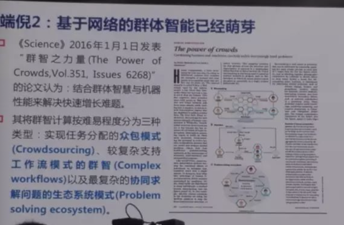 第二个案例,基于网络的群体智能,Science在去年发布了一个理念,群智理念,把这个难以程度分三个种类,第一个种类众包,第二个类工作流模式的群智,有一个先后的交替,第三个更复杂的求解问题,至少有三个模型就群智,美国的一些大学开始用群智来进行研究。