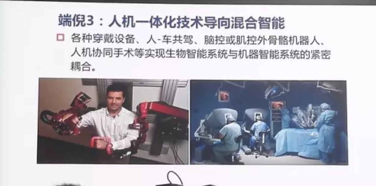 第三个阶段,人机一体化技术导向混合智能。这上面是外国做成功的系统,我们可以看到各种各样的穿戴设备。