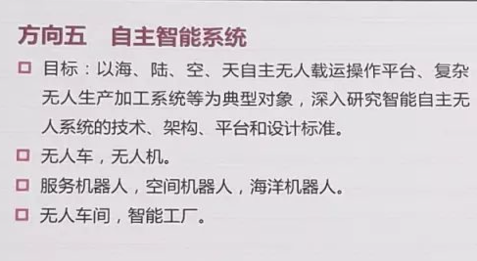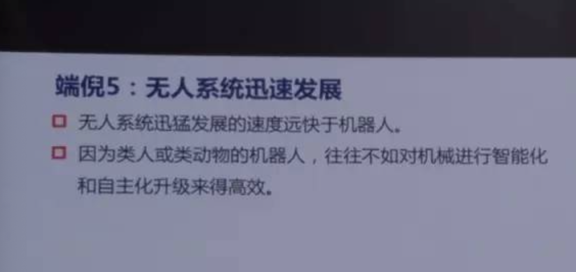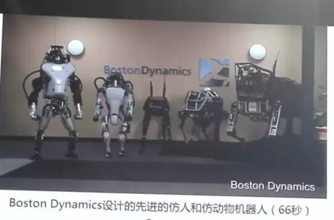 第五个阶段,无人系统迅速发展。人工智能开始的时候,是用计算机来模拟人的行为,所以把它称为机器人,但是60年的发展,机器人固然发展的很快,但是比机器人更快的,是无人系统,无人飞机,无人车,无人车一上的话那我们满街都是机器人,为什么?因为去模拟人并不是智能化最好的办法,我们可以看到,机器人一些精彩的发展,这是美国波士顿动力公司做的机器人,这是全世界做机器人最好的公司之一,两腿机器人和四脚机器人,四脚机器人也就是美国军方过去用的。