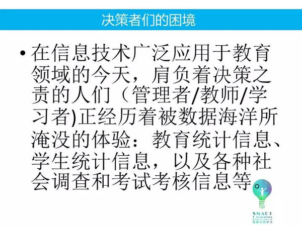 当然,有了数据并不能自然而然的为你的决策做支持。在我们教育领域实际上有这样一种困境,在信息技术广泛应用于教育领域的今天,肩负着决策之责的人们,管理者、教师、学习者,正经历着被数据海洋所淹没的体验, 决策者们淹没在数据的海洋中,却又忍受着信息的饥渴。但是随着计算机技术的不断发展,我们认为数据以及数据挖掘可以作为决策的依据,我们能够通过数据挖掘的方式让数据说话。