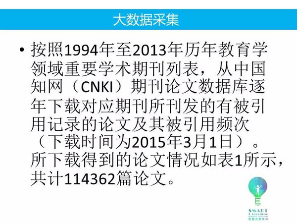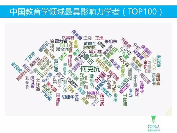 还有一个例子是研究队伍的组建决策。国开是一个成人高校,他的研究力量比较薄弱,我们希望能够在教育方面有所体现,我们希望能像开放办学一样开放搞研究,找人才。找人才我们需要有依据,那依据是什么呢,我们要采集数据,了解在全国到底有哪些人在这方面做的比较好,我们知道做研究就会发论文,发论文就会在CNKI收录。那我们就采集来自CNKI20年的全国从事教育的论文,我们采集到了到2013年的大概11万篇,我们就得到了中高教育学领域最近影响力的学者TOP100。但是这还不足以帮我们去遴选我们需要的专家,我们还进行了一个聚类,聚类原则就是具体原则是,一般来说,一个学科的专家会在自己的心爱的期刊发文章,我们根据期刊特征进行了一个聚类,发现第一类和第二类聚类非常准确。