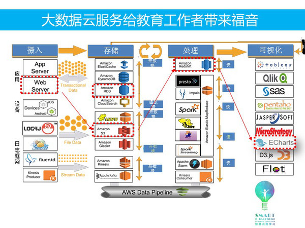 现在很多的云服务可以为我们的大数据工作者带来一定的福音,因为我们不需要去维护机房提高服务性能,像亚马逊提供的这一套解决方案里,从数据采集、数据挖掘到数据可视化提供了一个系统的方案,大家可以选购。
