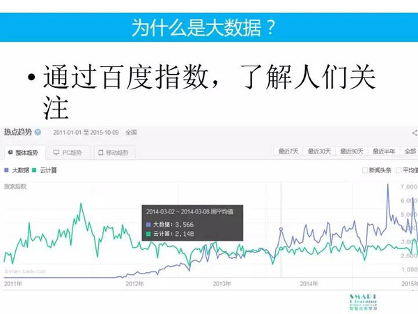 前面的专家已经分享了一些比较宏观的框架,接下来会说一些具体的事情。 通过百度指数可以看出大家都在关注大数据。通过百度指数我们看过去五年对比云计算和大数据,在2014年以前是云计算占优势,2014年之后大数据占了优势。这个转变发生在2014年3月4日,这一天发生了什么呢?马云在这一天发表这样一个观点“人类正从IT时代走向DT时代”,可见这是一个人物的影响力。