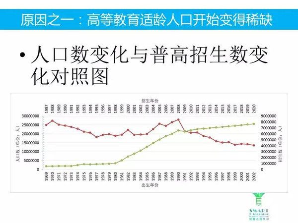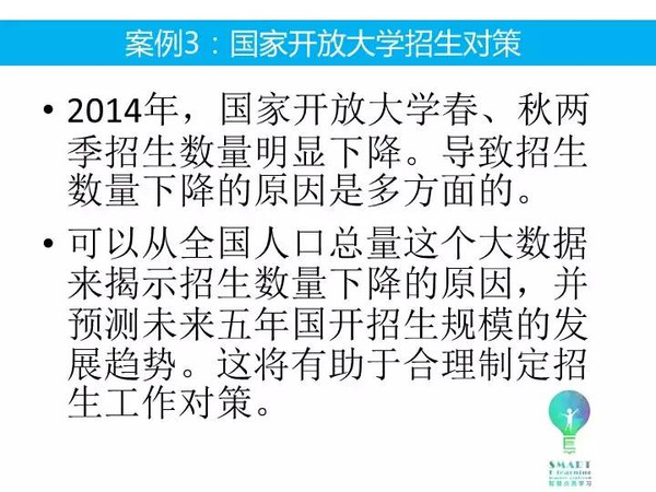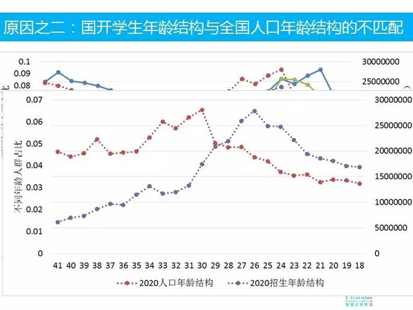 另一个案例就是国开近年招生数量在下降,这是由于各种主观和客观的因素造成的。我主要从客观原因分析,从全国人口总量这个大数据里面来分析,一是高等教育适龄人口开始稀缺,下面这个图中绿线是从八七年以来普高招生情况,普高招生的量逐年上升,但是人口曲线可以看出人口量下降非常快,这与我们国家调整人口政策有一定关系。
