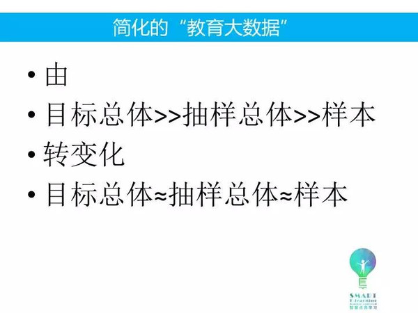 我在做这个事情的时候,怎么理解教育大数据呢?我们在做工作做研究的时候总是会有一个目标总体。比如我们做一个研究,了解全国中小学生的生活习惯,这个题目出来我们首先要抽样,找到北京市的实验小学找样本,但是这样全国的的中小学学生一下缩到了北京市的某所小学上,这样做目标整体远大于样本。但是如果我们能做的目标整体约等于样本的话,我认为这做到全量。