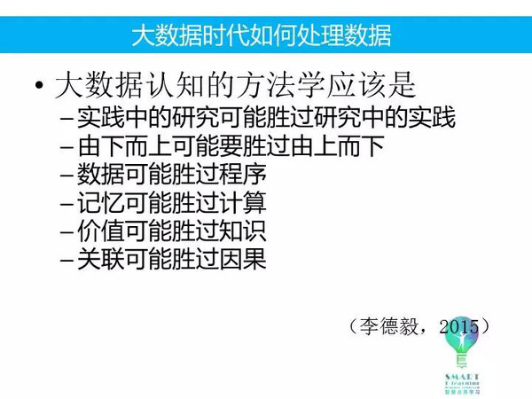 同样李德毅院士在一份报告中提到 大数据认知的方法学应该是实践中的研究可能胜过研究中的实践,由下而上的可能要胜过由上而下,数据可能胜过程序、记忆可能胜过计算,价值可能胜过知识,关联可能胜过因果,这个观点和前面是类似的。