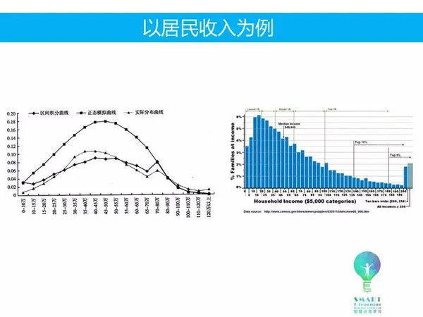 下面这个案例是各类教育在线学习质量与办学规模的判断。在这个案例中我采集成人高等教育、高等职业教育以及社区教育等三类教育的在线学习大数据,向决策者反馈在线学习现状,并得出小规模组班教学才是有质量的在线学习的重要保证。如果不是小规模会是一个怎么样的结果呢?图中有两个曲线,一个是正态分布曲线一个是无尺度网络曲线。无尺度网络曲线对应的是一个无穷大无穷小。做教育的人不希望看到这样一个曲线,就是整个班级中学生的成绩优秀的不是很大差的也不是很多,大多数学生集中在一个中等水平。我们看一个具体的例子就是居民收入就是这样一种分布。像日本他们的居民收入大致就是这样一种分布。像美国对高收入人群限制不够严格,他们的曲线就与日本不同是右图这样一个曲线。我们同样可以假定,如果教学干预不严格的话,学生表现也是一个无尺度网络曲线。