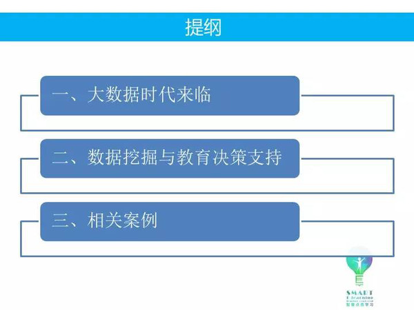 魏顺平 博士 以下为魏顺平博士报告全文大家下午好。非常荣幸能够站在这里做分享,因为我以前在下面听课。 我今天的分享从以下三方面来介绍。一、大数据时代来临;二、数据挖绝与教育决策支持;三、相关案例。