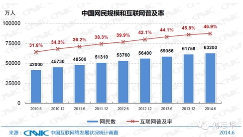 截至 2014 年 6月,我国网民规模达 6.32亿,较 2013年底增加1442 万人,互联网普及 46.9%,即接近一半的中国人在使用互联网。互联网的增长速度超越了很多人的预期:4年前即2010年6月,互联网普及率为31.8%,而仅经历了四年,互联网的普及率增加了超过15%。